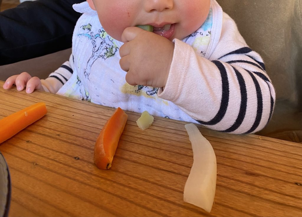 我が子がBLWを始めた生後7か月頃も、まだ歯は生えておらず、歯茎だけなので(これがまた可愛いのですが☺)用意する野菜などは全て、茹でたものか蒸したものを用意するようにしました。